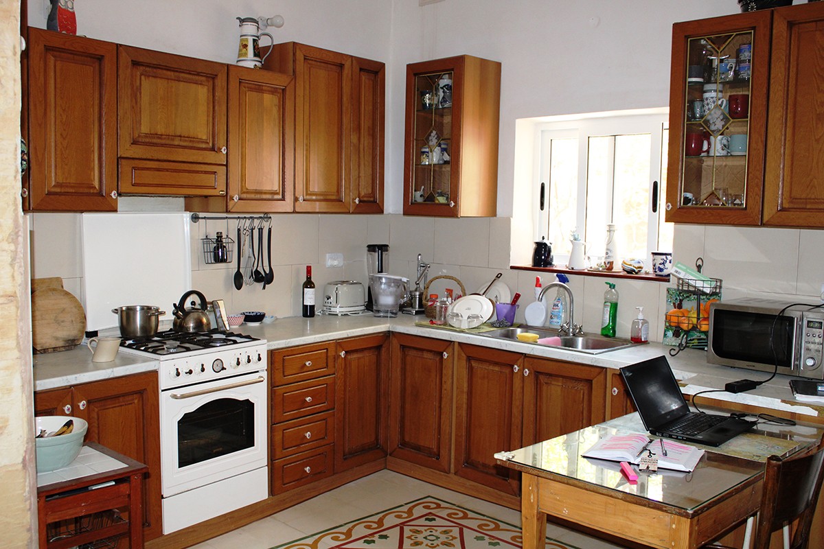 Semi-detached with two entrances and adjacent to a recently restored chapel, the house has a total of 14 rooms, three of which have been converted to the ‘heart of the house’: an open plan sitting, dining and kitchen area which leads to the outside terrace, garden and five rooms surrounding it. The house has currently two bedrooms but can be converted into a property with one or more bedrooms added to it. It has also plenty of space for an outdoor or roof pool. The garden can be watered all-year round cost-free through the house’s own bell shaped, 7×7 metre well which receives rainwater collected from roofs and the terrace. The house has no garage but easy car access and plenty of parking opportunities directly nearby.